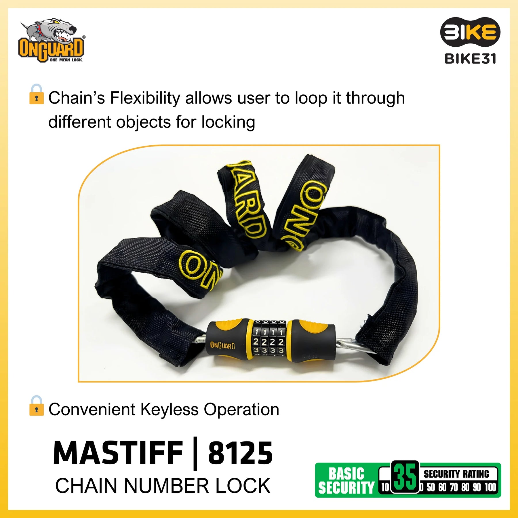 Secure your bike, locker, or gate with our versatile bicycle chain lock. This 120cm, 4mm thick chain offers basic protection against theft. Its flexible design loops through various objects easily. Enjoy raised dials for simple control and a steel ball click gear system to resist picking and pulling. Plus, the embroidered logo chain cover protects paint and finishes.