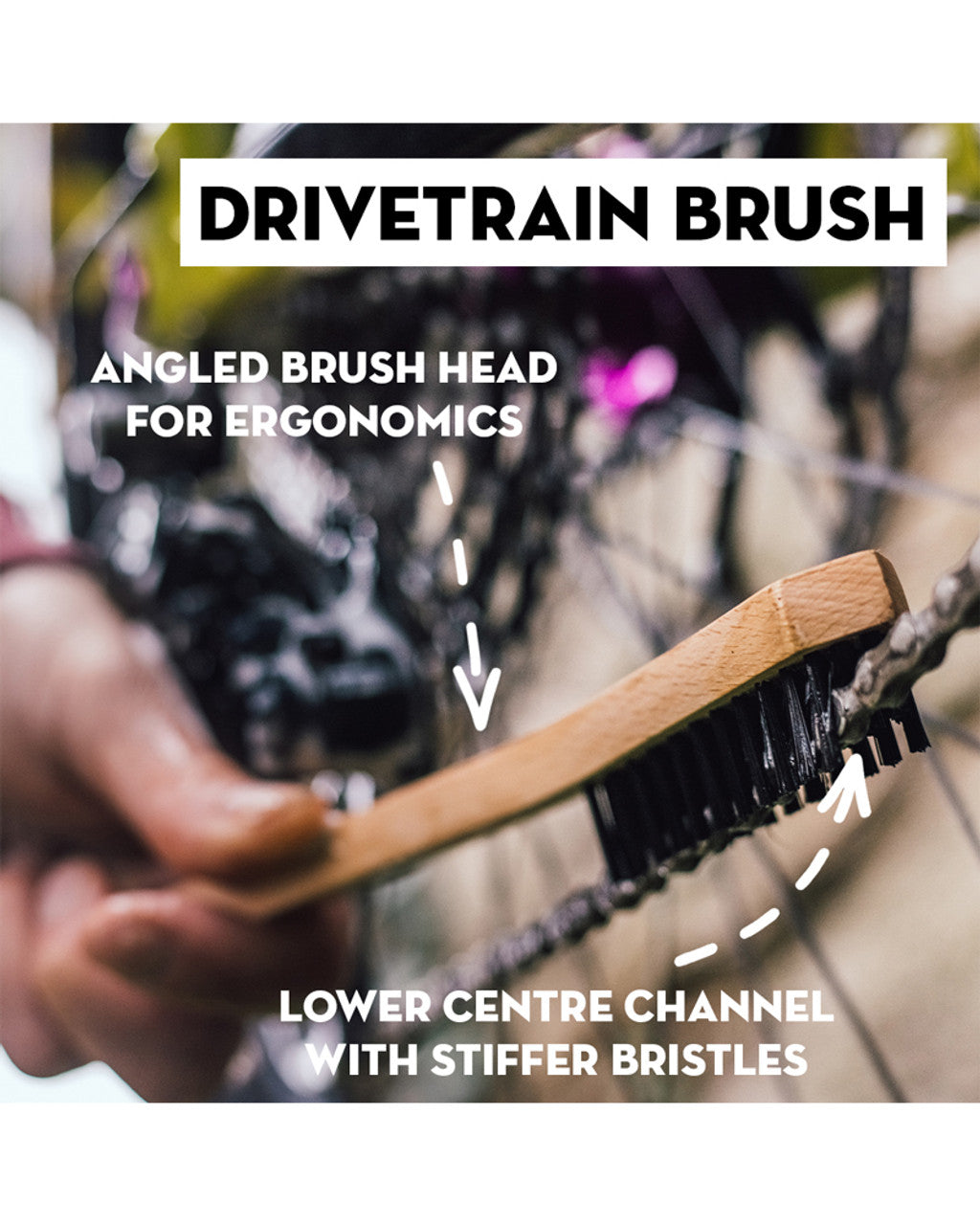The stiff, durable bristles of Peaty's Drivetrain Brush have a low middle channel for the chain to sit into. This creates stiffer bristles in the centre for tough scrubbing, while the chisel-cut tip helps to scrape gunk off jockey wheels.