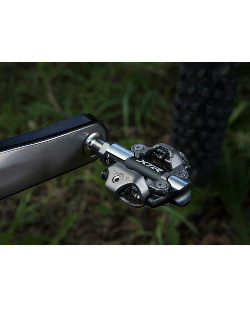 • Shimano XTR PD-M9100 SPD pedals come with SM-SH51 single release shoes cleats and are also compatible with SM-SH56 multi-release shoes cleats. It has chromoly spindles and spin on sealed bearings. The tension of the retention mechanism can be adjusted via a hex screw on the back of each pedal on both sides.