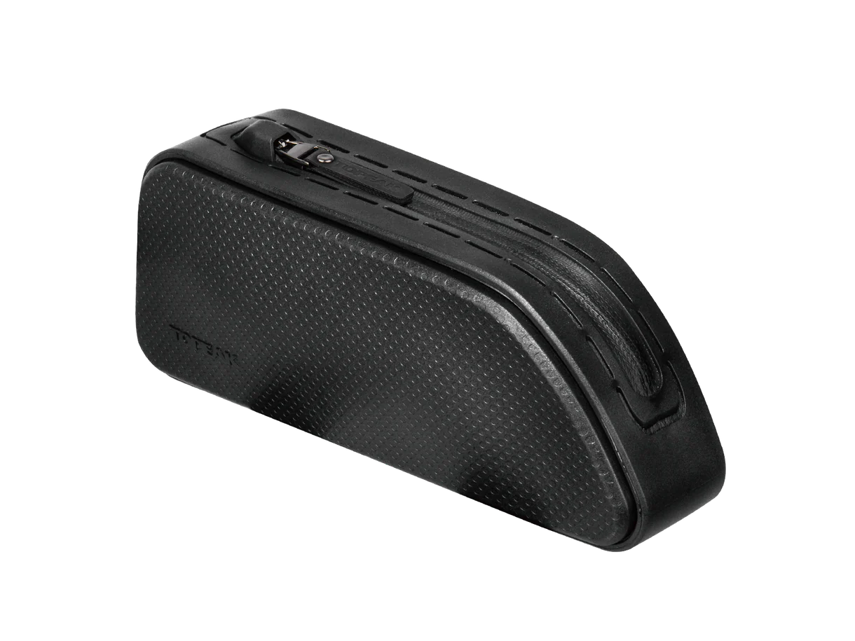 A hard shell, weatherproof top tube mounted bag features a streamlined shape to eliminate leg contact. Large capacity zippered compartment gives cyclists quick and easy access to energy bars, smartphone, tools or any small essential gear they need.