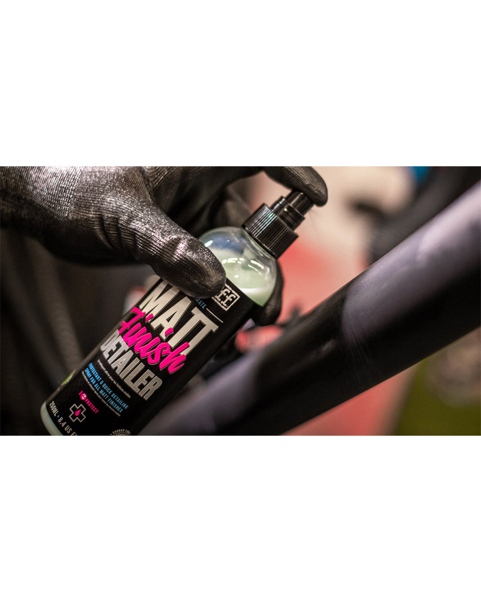Get any matt frame or forks looking back to its best with Muc-Off Matt Finish Detailer. Enjoy a streak-free finish! Fingerprints and glossy marks are now a thing of the past. Matt Finish Detailer has been specifically developed for satin matt paints, matt finishes and matt vinyl wraps. The premium-grade formula will leave any matt surface with a streak and gloss-free protective finish that reduces dirt adhesion.