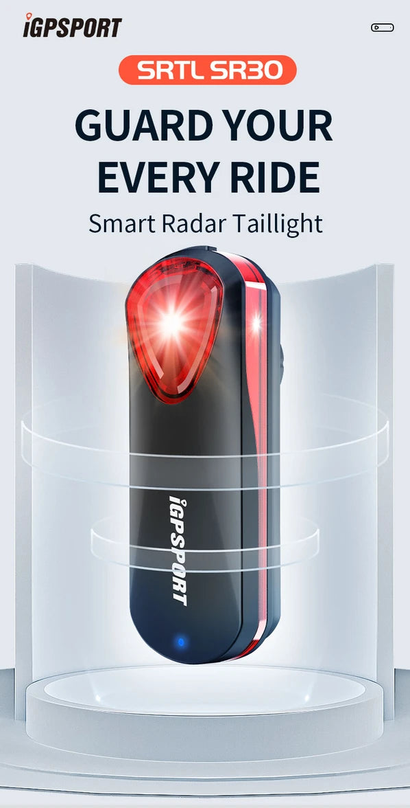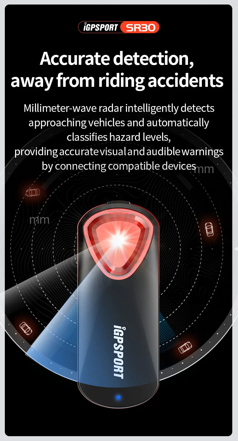 GPSPORT SR30 Smart Radar Taillight. This cycling accessory offers high visibility with a visible distance of 1.6km(5249ft) when viewed from the rear in a straight-line distance. It provides multiple taillight modes to meet different scenarios, allowing you to customize the lighting patterns or flashing modes based on your preferences. The taillight is compatible with bike computers, watches, and devices that support standard protocols, including the iGPSPORT APP. With its high-performance radar, it can detect approaching vehicles within 150m(490ft), providing timely warnings for enhanced riding safety. Additionally, the SR30 supports charging via a TYPE-C cable, ensuring convenient power supply. Riding safety with the iGPSPORT SR30 Smart Radar Taillight.