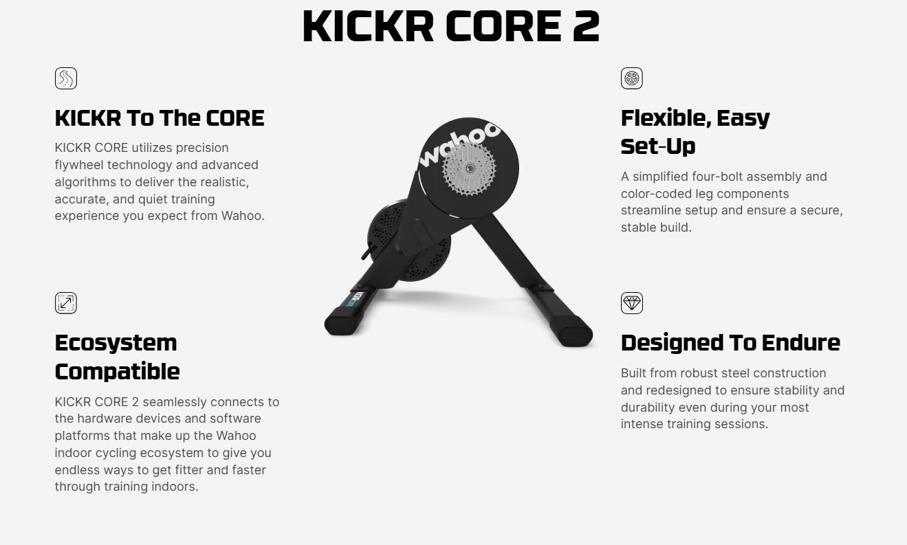 KICKR CORE 2 is the smarter way to start riding indoors. It builds on the trusted performance of the original CORE, and introduces a faster and easier setup, better connectivity, and the addition of key features from the KICKR ecosystem. Whether you're just getting into indoor cycling, or upgrading your training space, CORE is ready to grow with you.