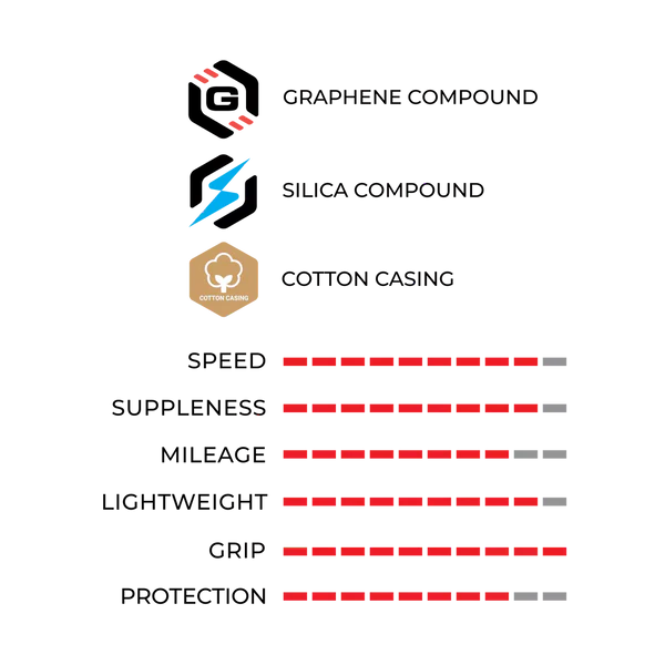 Ultimate cornering grip in wet or dry conditions. Reinforced puncture resistance. A supple construction that reduces rolling resistance and makes chattery chip seal feel like freshly laid tarmac.