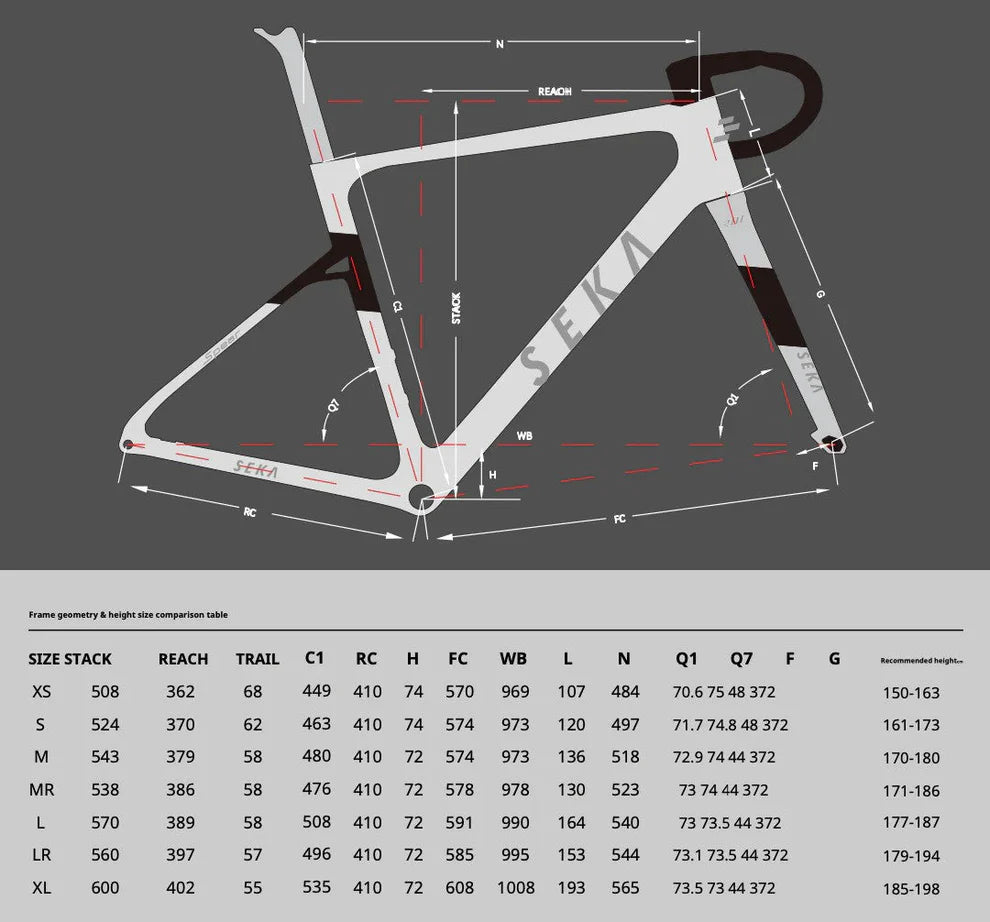 • 5 Regular Geometry | XS, S, M, L, XL + 2 Racing Geometry | MR, LR
