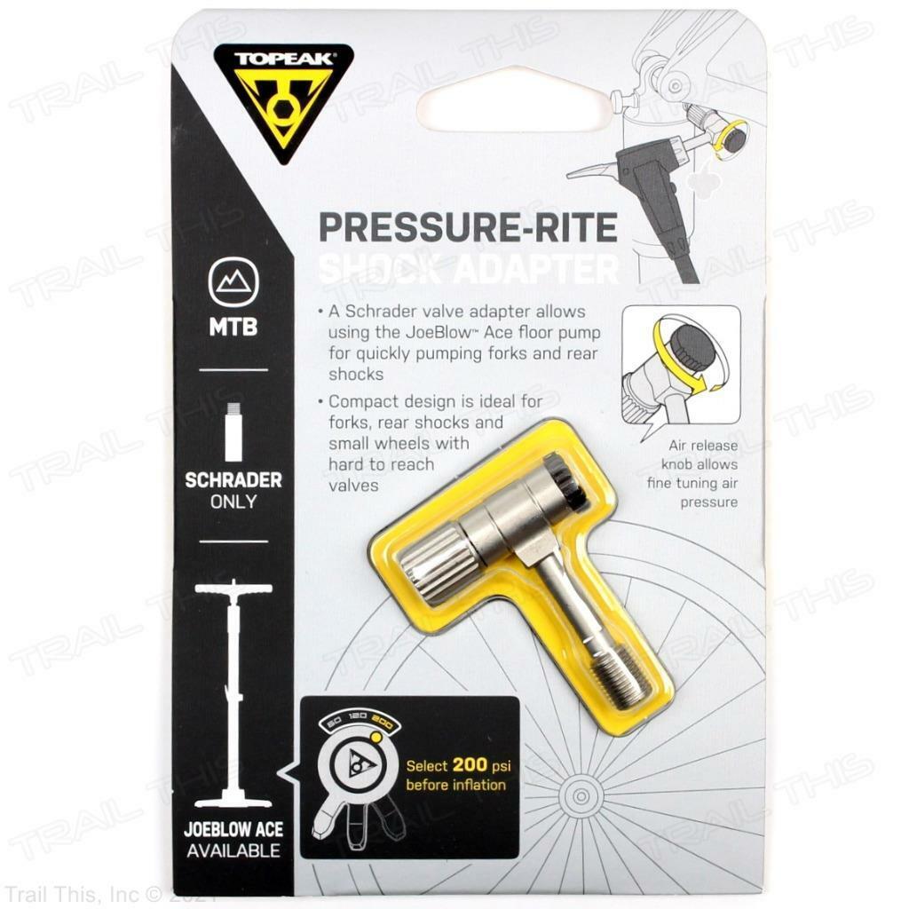 A Schrader valve adapter allows using the JoeBlow® Ace floor pump for quickly pumping forks and rear shocks. Built-in air release knob allows fine tuning air pressure.