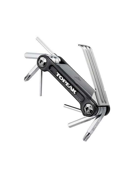 9 function pro quality tool folds in a sleek forged alloy body. An additional removable folding tire lever stores inside the tool body for a streamlined profile. Perfect for long road rides or endurance mountain biking. Includes a neoprene bag.