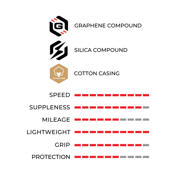 Featuring an advanced Graphene + Silica compound specifically designed to provide unparalleled efficiency, Corsa PRO Speed maximizes speed, grip, and control ensuring faster times and smoother rides.